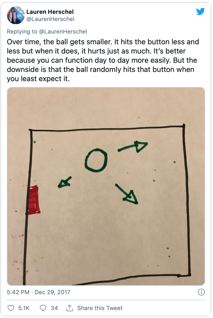 My friend replied along these lines. And then he shared this analogy of grief with me: “The Ball and the Box.” Several years ago this analogy went somewhat viral through a series of tweets (you can read about it here). It seems like this is a somewhat common analogy shared by counselors and other mental health professionals with those for whom they care. I think it helpfully describes the experience of grief as time goes on and how to make sense of the times we seem to have been randomly “triggered” into fresh sadness.